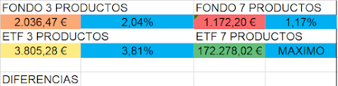 El mejor caso es el de 7 ETFs, veamos la diferencia en cuantía en euros y en porcentaje al cabo de 5 años, con el resto de casos: